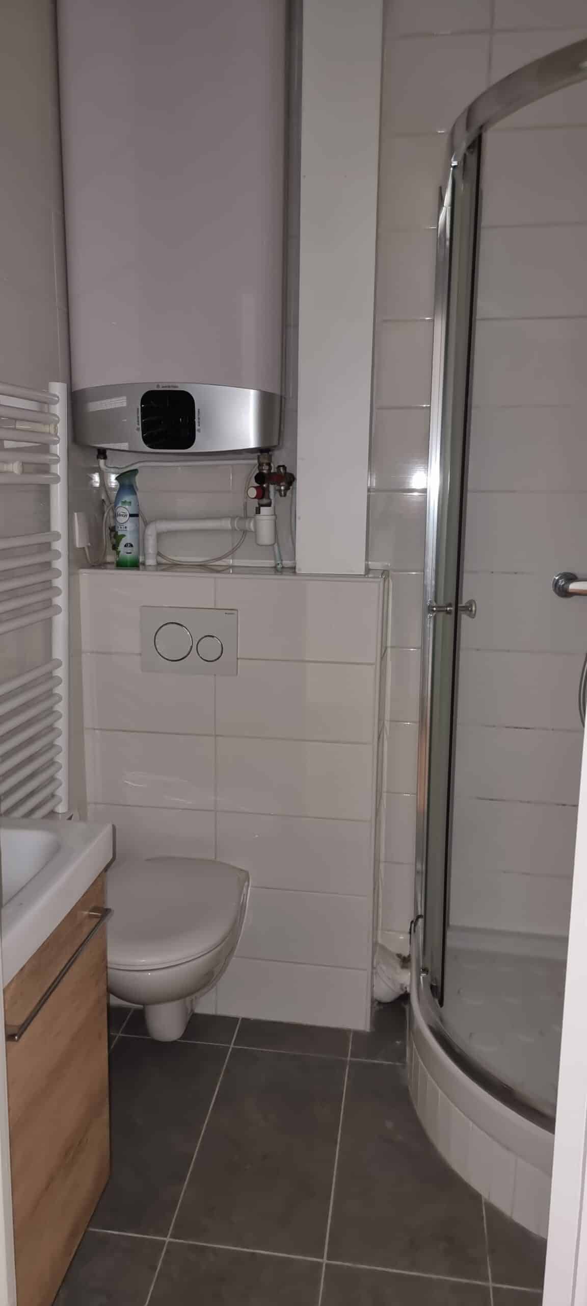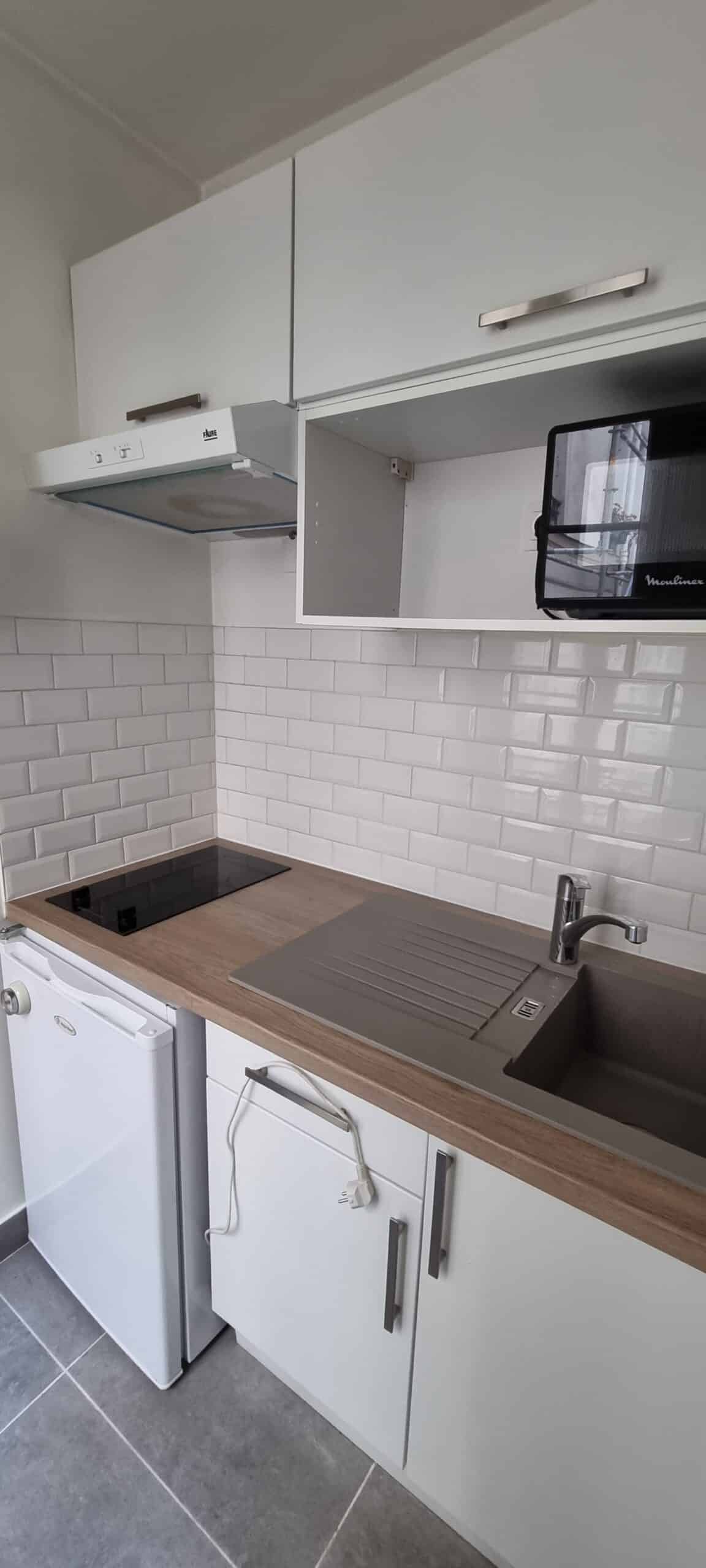 Il se compose d’une pièce à vivre avec placard, d’une chambre, d’une cuisine et d’une salle d’eau avec (vrai) WC.
